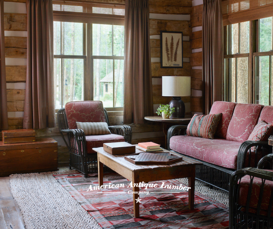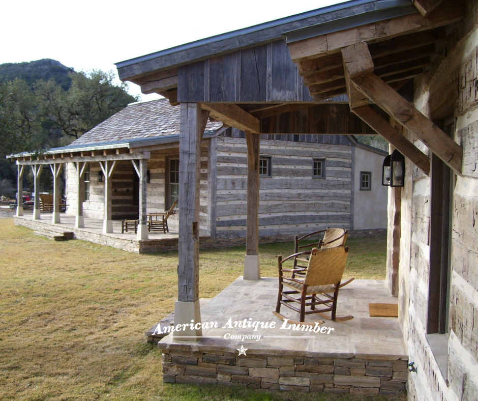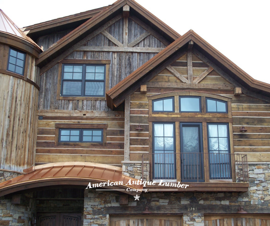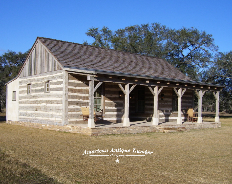 Our reclaimed softwood plank siding features rough-sawn texture, old fastener holes, and classic aged wood patina. This material can be used for exterior trim and fascia. Corner detail can be rough sawn or hand-hewn timbers in the same or a similar species. Material can be placed edge to edge or with chink joints.